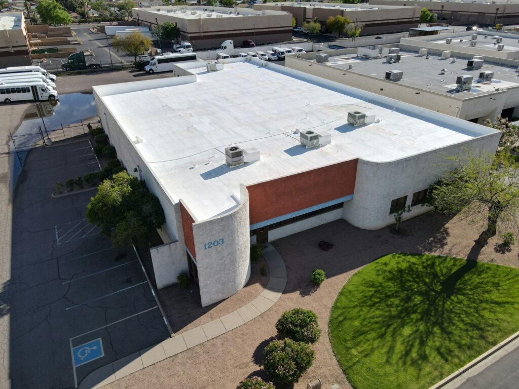 Our team completed a full roof replacement for a commercial building by removing the existing foam roofing system and the underlying built-up asphalt roof. The tear-off was performed in sections to ensure safety and efficiency, with damaged plywood decking replaced as needed. The new system included the installation of one inch of spray-applied polyurethane foam, finished with a three-gallon-per-square protective coating. This project was completed to manufacturer standards and is backed by a 10-year system warranty.