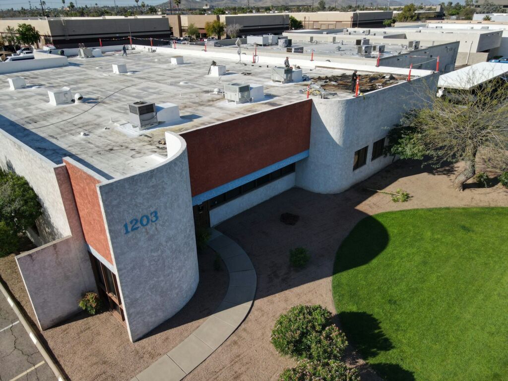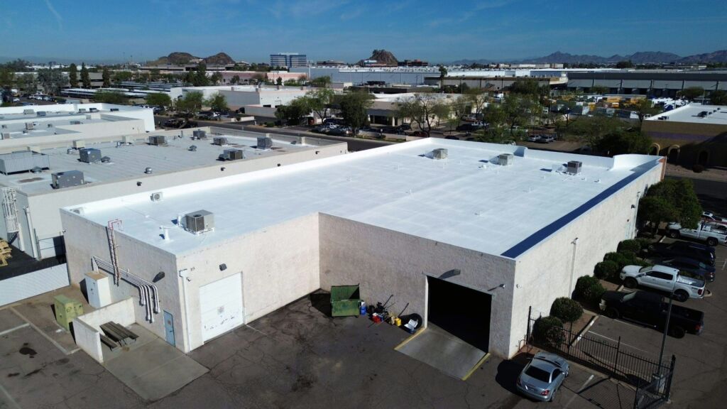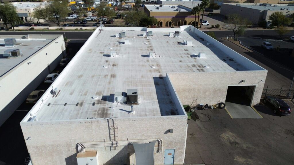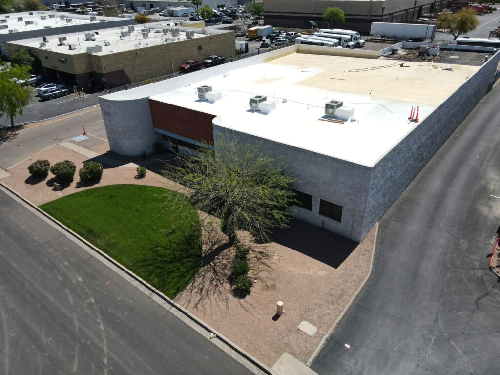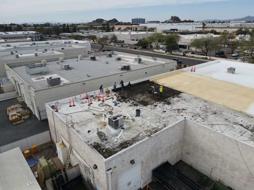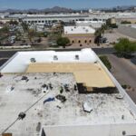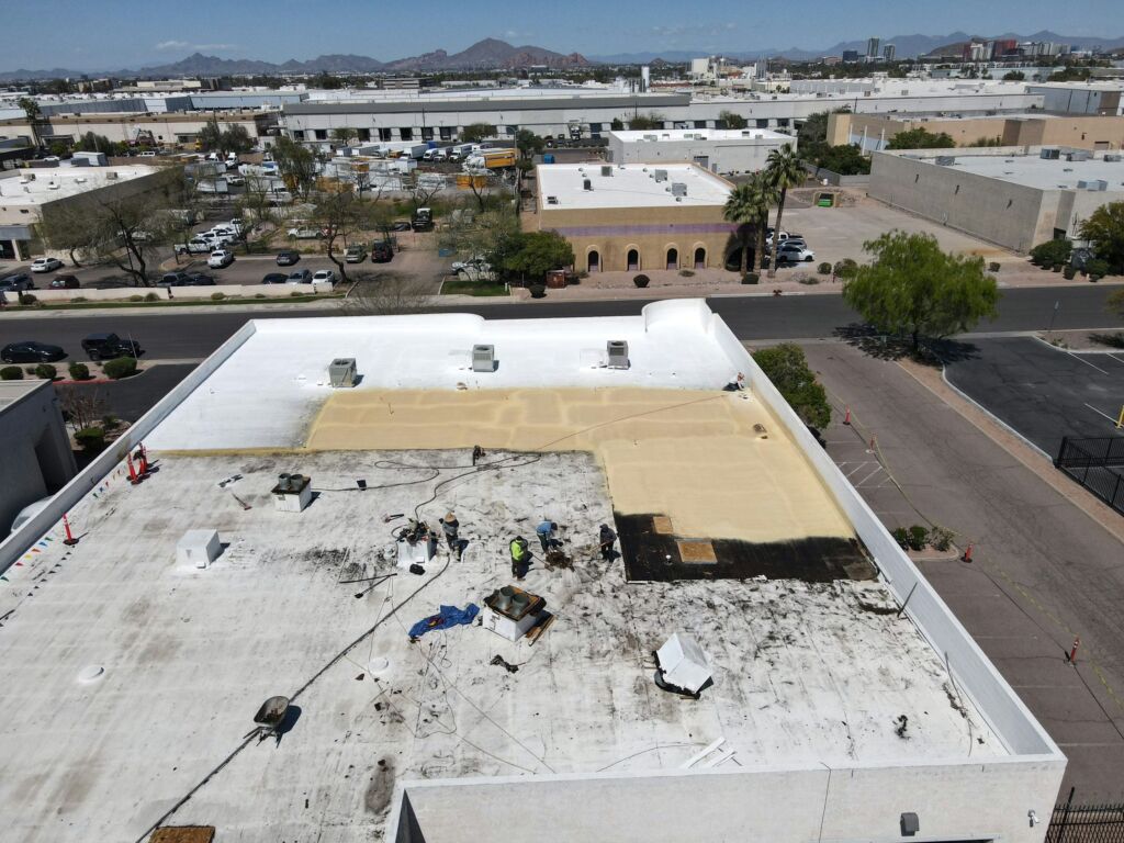 Our team completed a full roof replacement for a commercial building by removing the existing foam roofing system and the underlying built-up asphalt roof. The tear-off was performed in sections to ensure safety and efficiency, with damaged plywood decking replaced as needed. The new system included the installation of one inch of spray-applied polyurethane foam, finished with a three-gallon-per-square protective coating. This project was completed to manufacturer standards and is backed by a 10-year system warranty.
